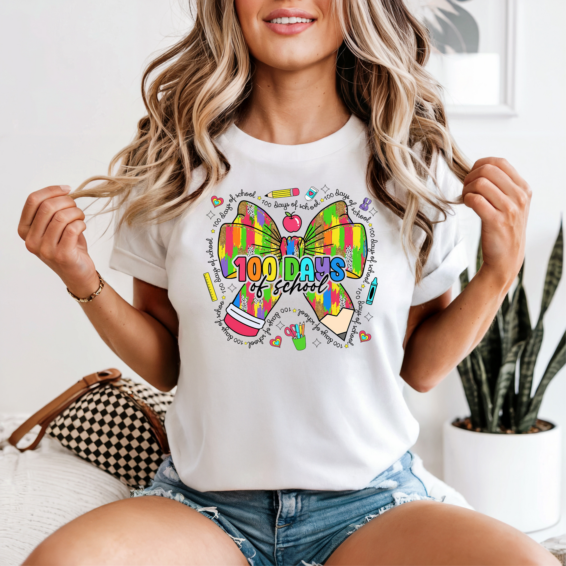 Celebrate a major classroom milestone in style! Our 100 Days of School tee features a vibrant bow design with colorful school-themed icons, making it perfect for teachers and students alike. Whether you're throwing a class party or snapping pics with your little learners, this playful tee will be a hit. Printed on a soft, high-quality Comfort Colors® shirt for a comfy all-day fit.