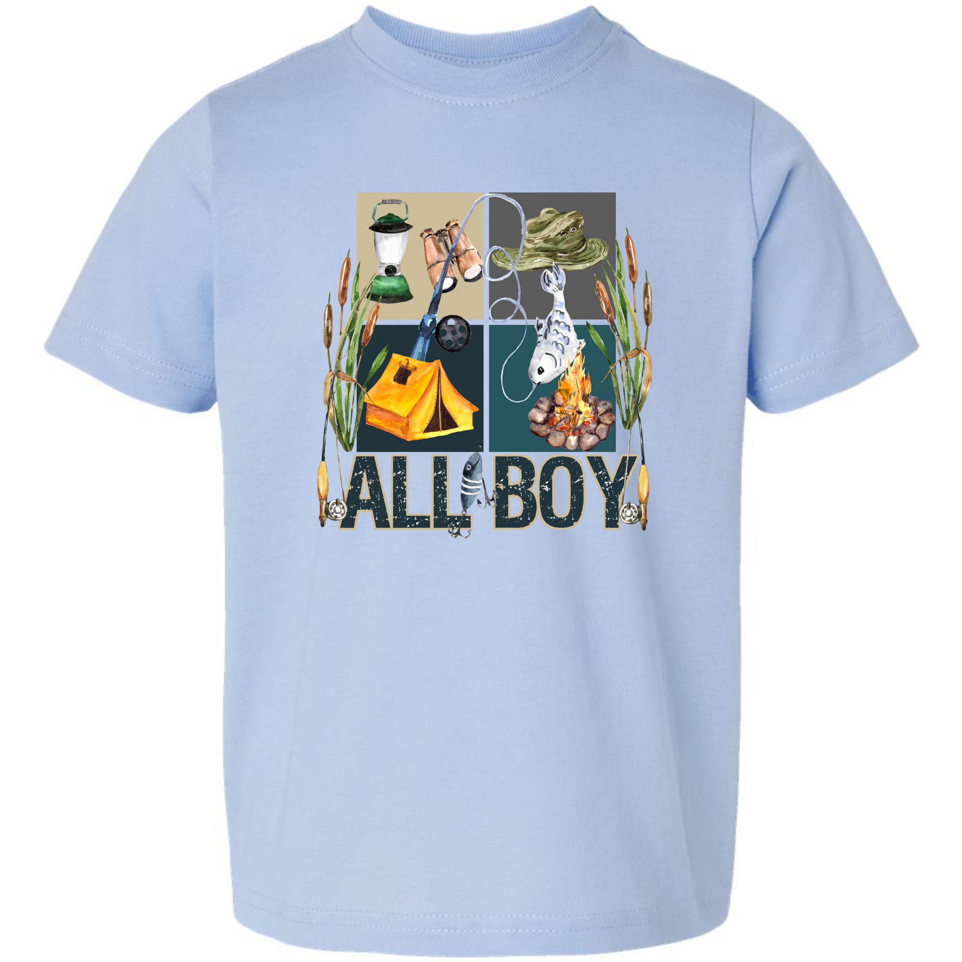 Fishing poles, camping gear, muddy boots… yup, he’s All Boy! This adventure-packed design features a grid of outdoor essentials—from tents and lanterns to a campfire and a fish skeleton. Whether he’s exploring the backyard or gearing up for a real camping trip, this Rabbit Skins tee is made for rugged little explorers with big imaginations.