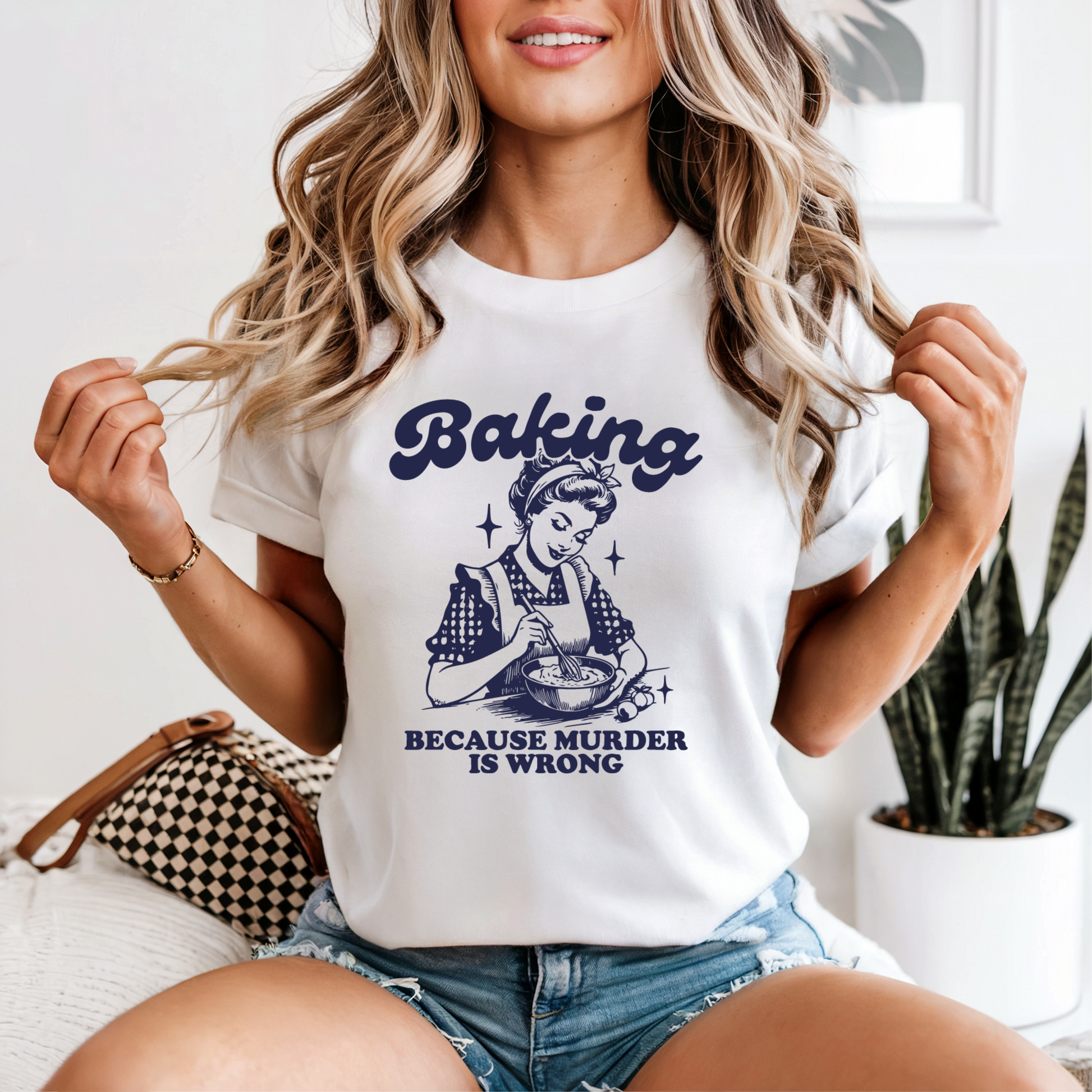 Our “Baking Because Murder is Wrong” graphic tee brings retro charm with a side of sarcasm. Featuring a vintage-inspired housewife mixing it up (instead of losing it), this soft-as-butter Comfort Colors® tee is your new kitchen (or passive-aggressively silent rage) uniform.