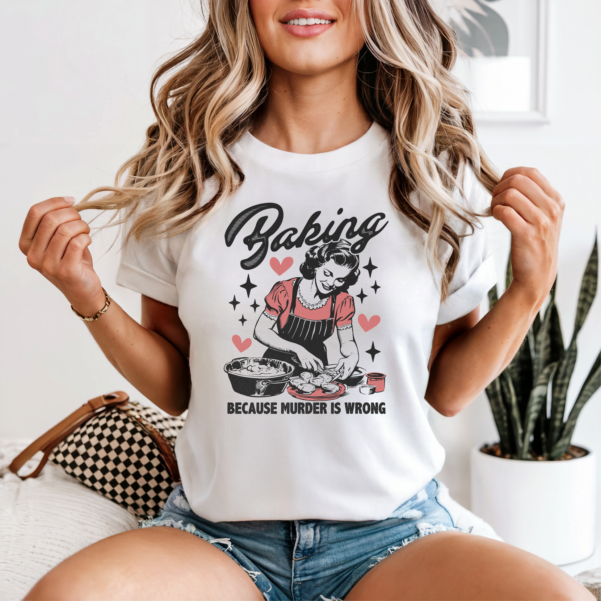 Our “Baking Because Murder Is Wrong” graphic tee serves up retro vibes with a generous side of dark humor. Featuring a perfectly polished housewife (who may or may not be hiding some rage under that apron), this ultra-soft Comfort Colors® tee is for the moms, grandmas, and chaotic bakers who bake to stay out of jail.