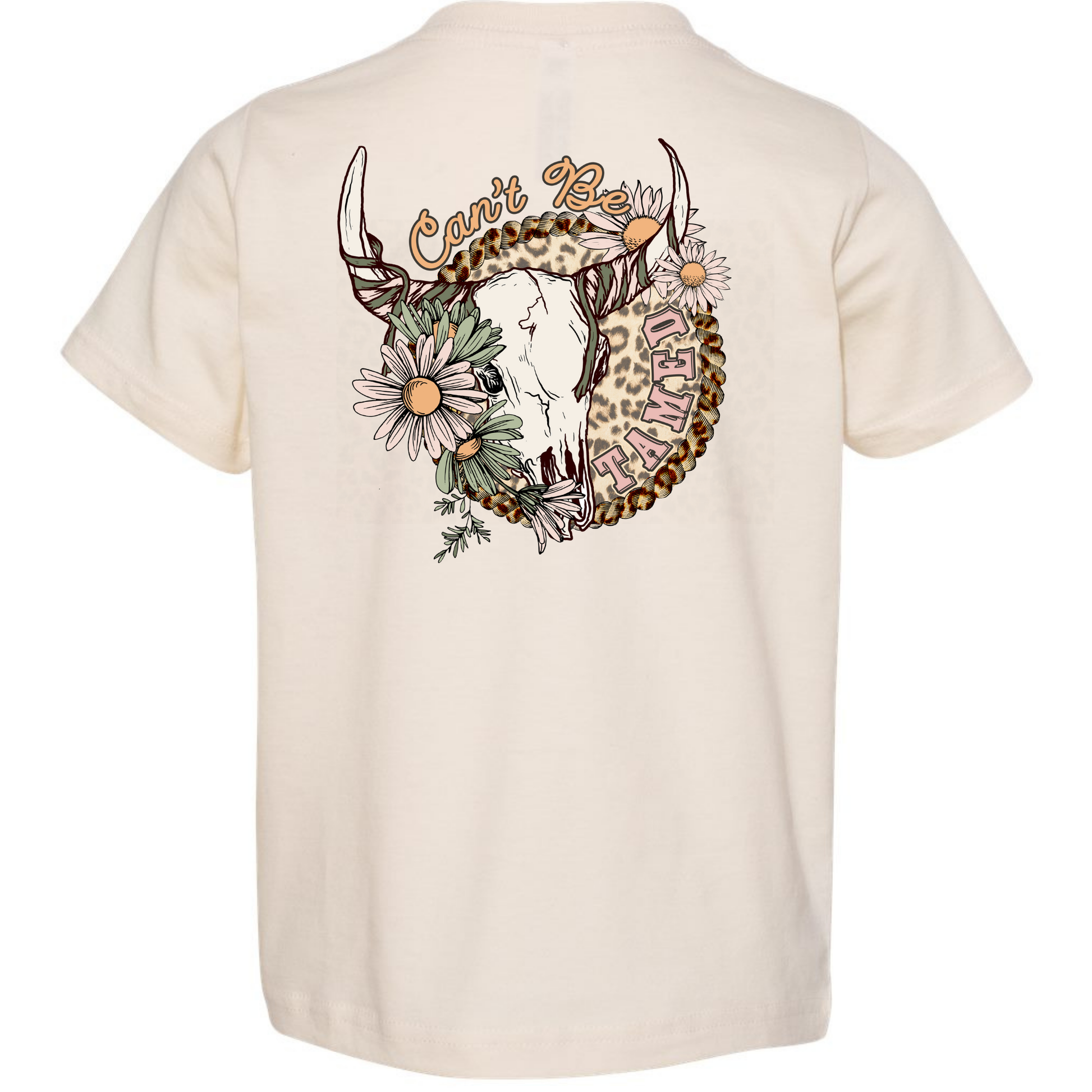 For the little wild spirit who refuses to be fenced in — our Can’t Be Tamed kids graphic tee is full of personality and punch. Featuring a boho cow skull adorned with daisies, leopard print accents, and western rope details, this tee is perfect for your free-spirited cowgirl or cowboy.