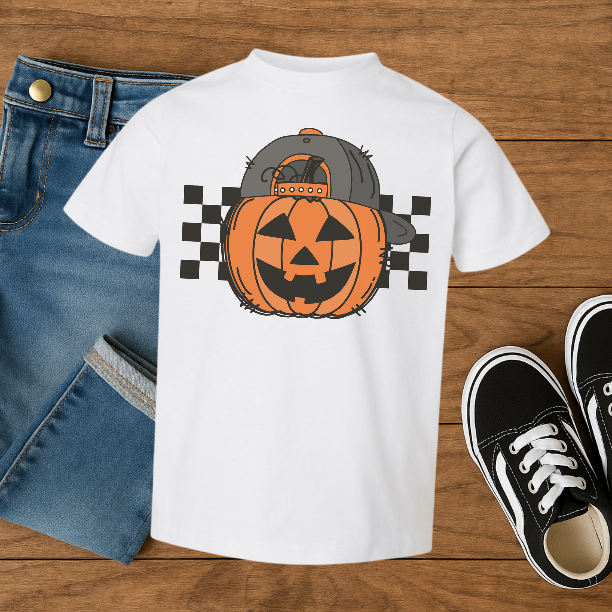 🎃 Playful Pumpkin Design – jack-o’-lantern with backwards baseball cap & checkered background