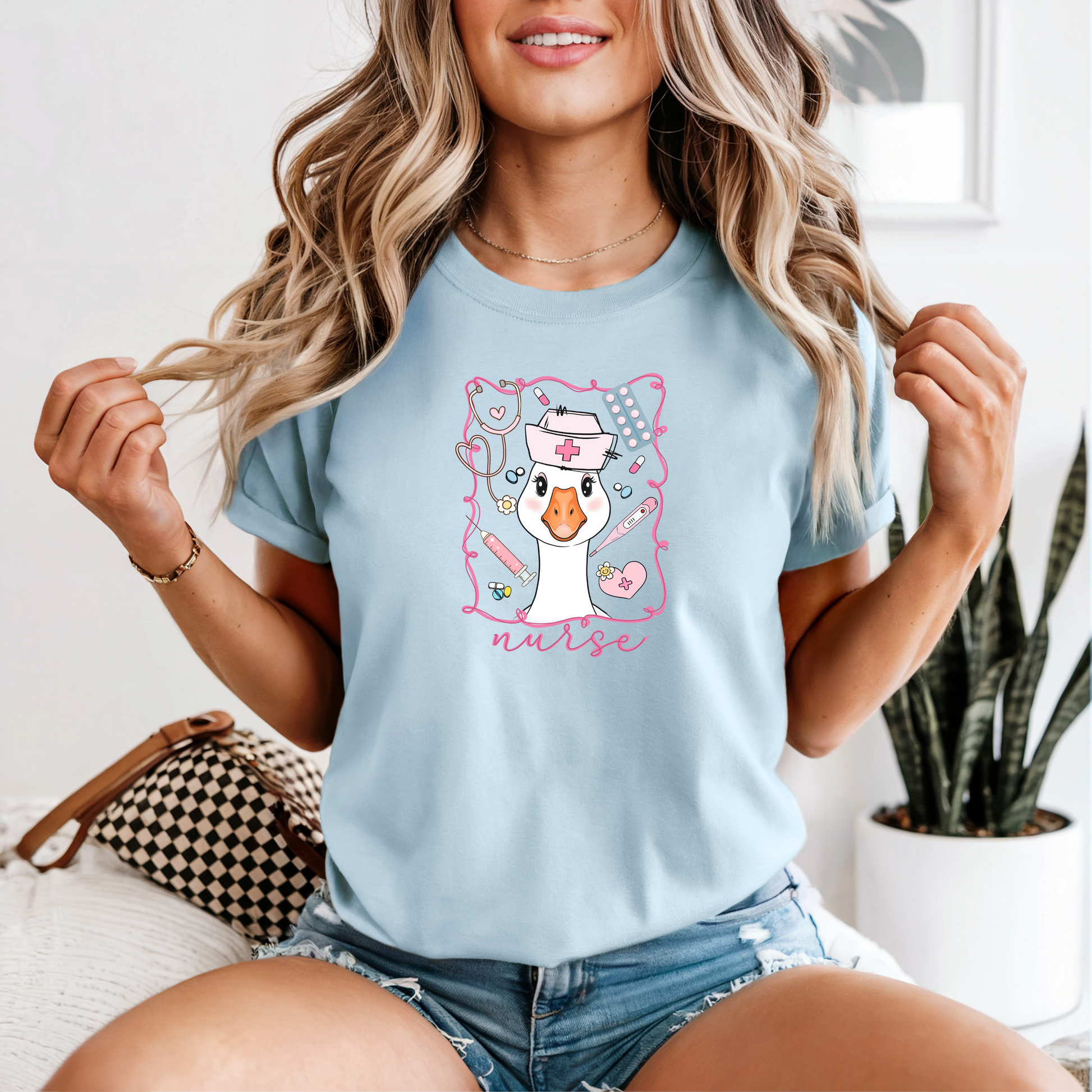 Our Nurse Goose Graphic Tee is the quack-tastic way to show off your nursing pride with a little sass and a whole lot of heart. Dressed in pink and surrounded by all things nurse life—stethoscopes, syringes, scrubs, and pills—this goose is ready to serve with style.