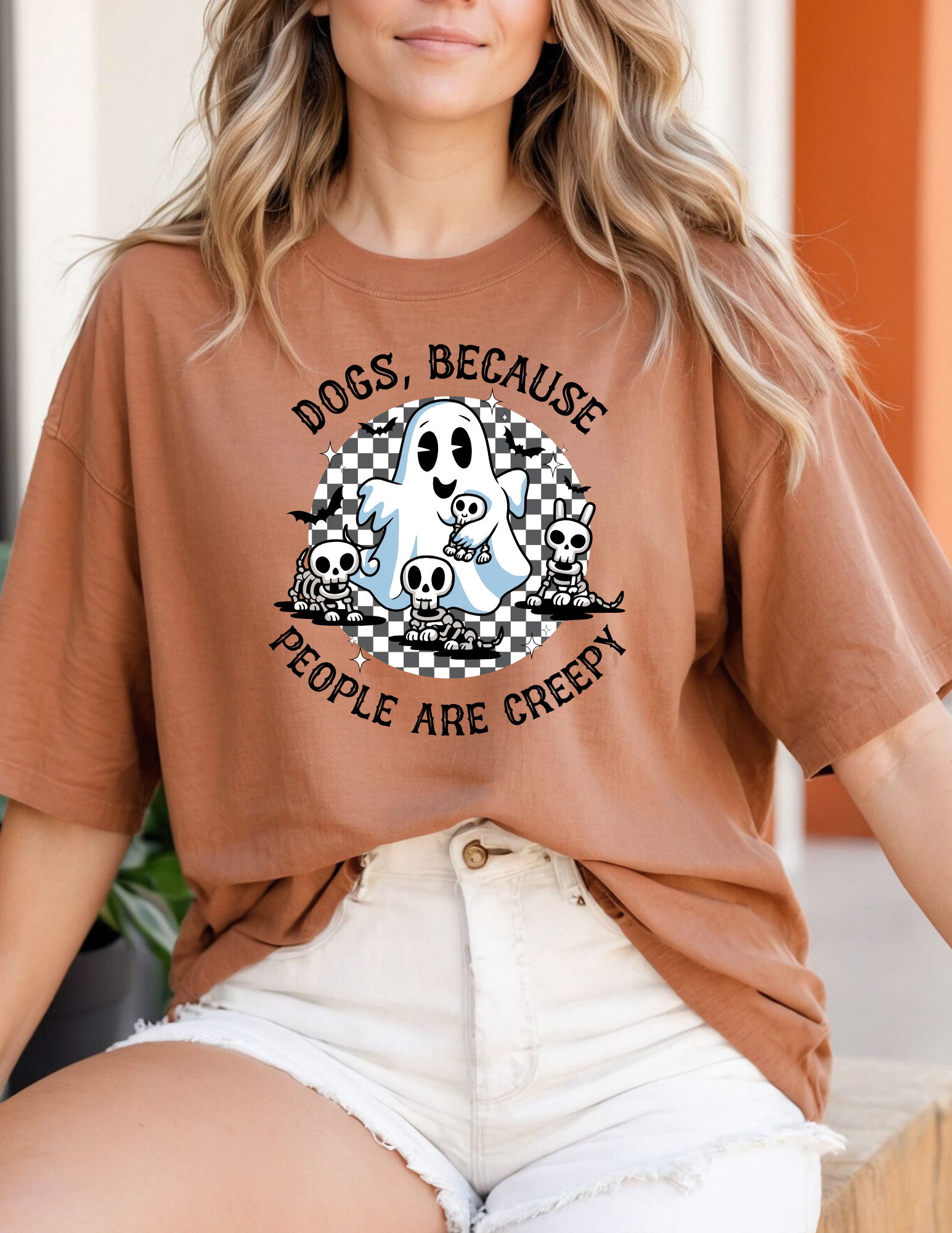 “Dogs Because People Are Creepy” Halloween Graphic Tee – Ghost & Skeleton Dog Design