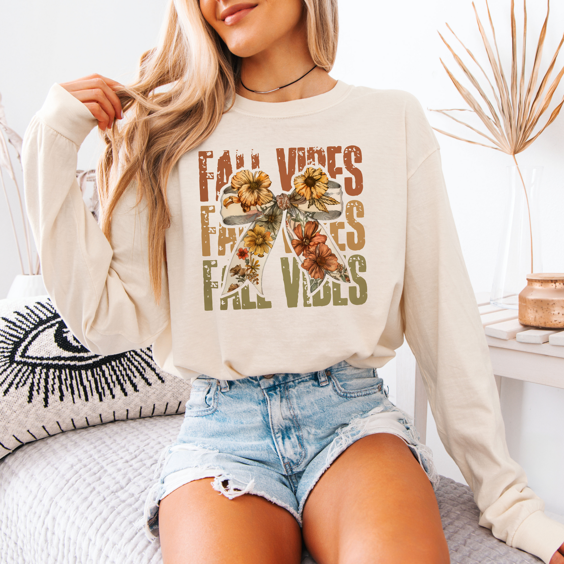 - Gorgeous floral bow and “Fall Vibes” retro graphic