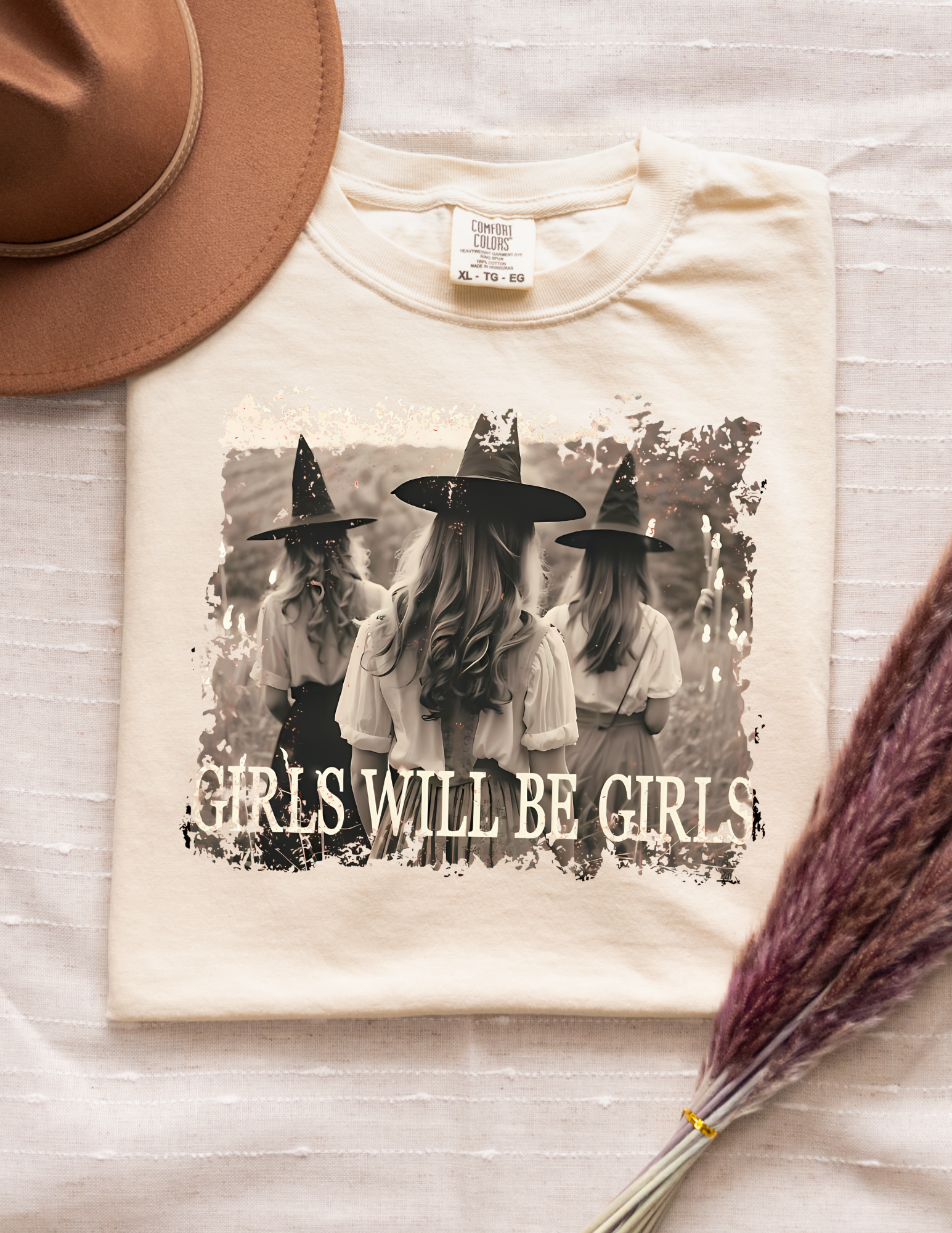 Bring witchy vibes and girl power together with our Comfort Colors® Girls Will Be Girls Graphic Tee. Featuring a vintage-inspired sepia print of three women in classic witch hats, this shirt blends rustic fall style with a hint of spooky sisterhood. The distressed border adds a retro, lived-in aesthetic that makes this tee a timeless fall favorite.