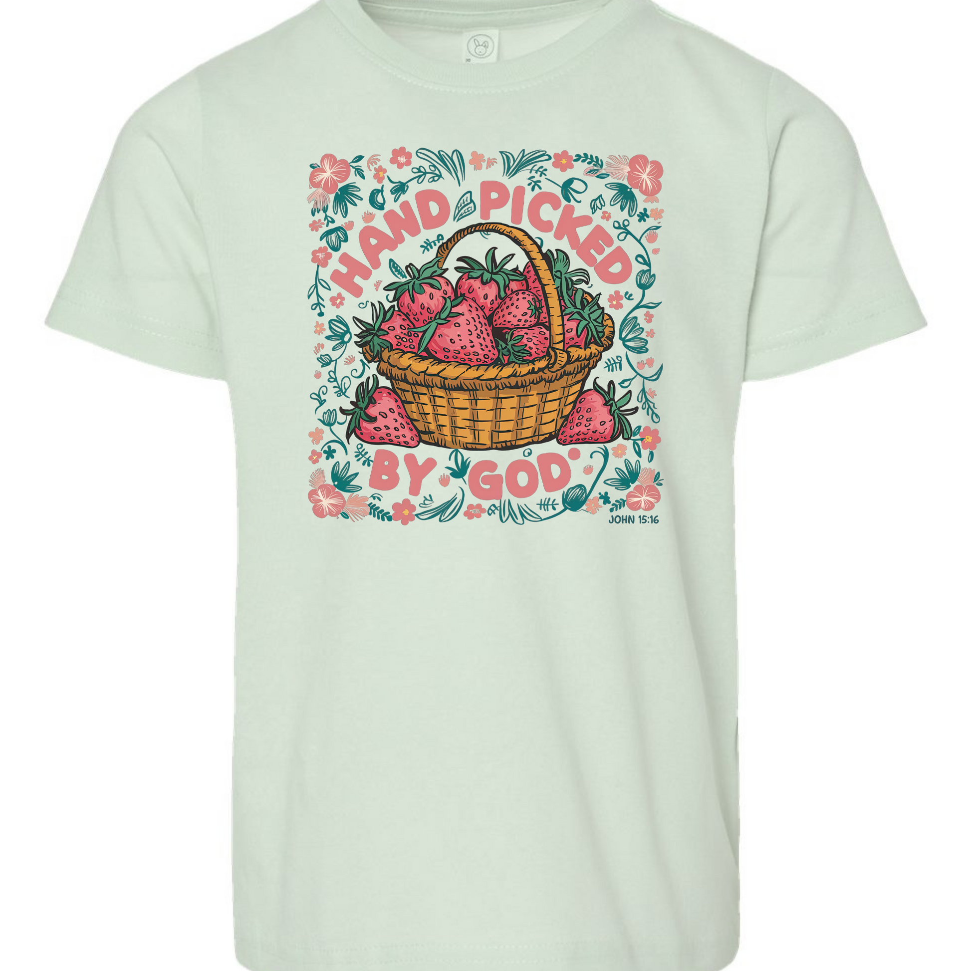 Sweet, meaningful, and bursting with color—this faith-inspired tee features a vibrant strawberry basket surrounded by floral detail and the message “Hand Picked By God,” based on John 15:16. It’s a beautiful reminder of worth, purpose, and God’s love. Made with soft Rabbit Skins cotton and a whole lot of heart.