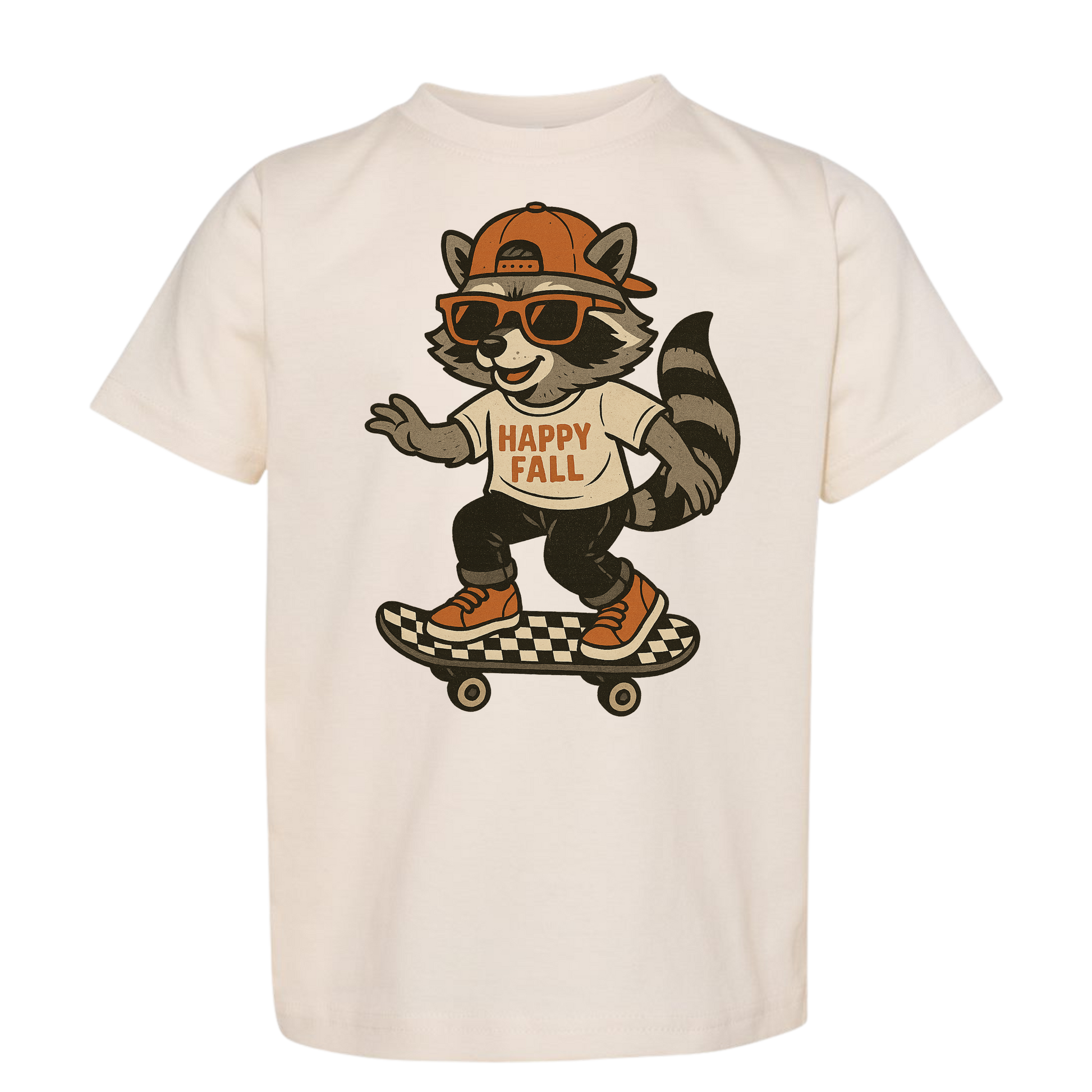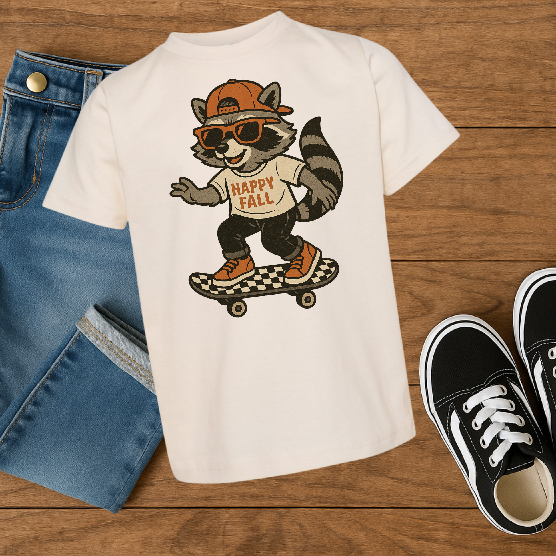 “Happy Fall Raccoon” Kids Graphic Tee – Cute Skateboard Autumn Shirt