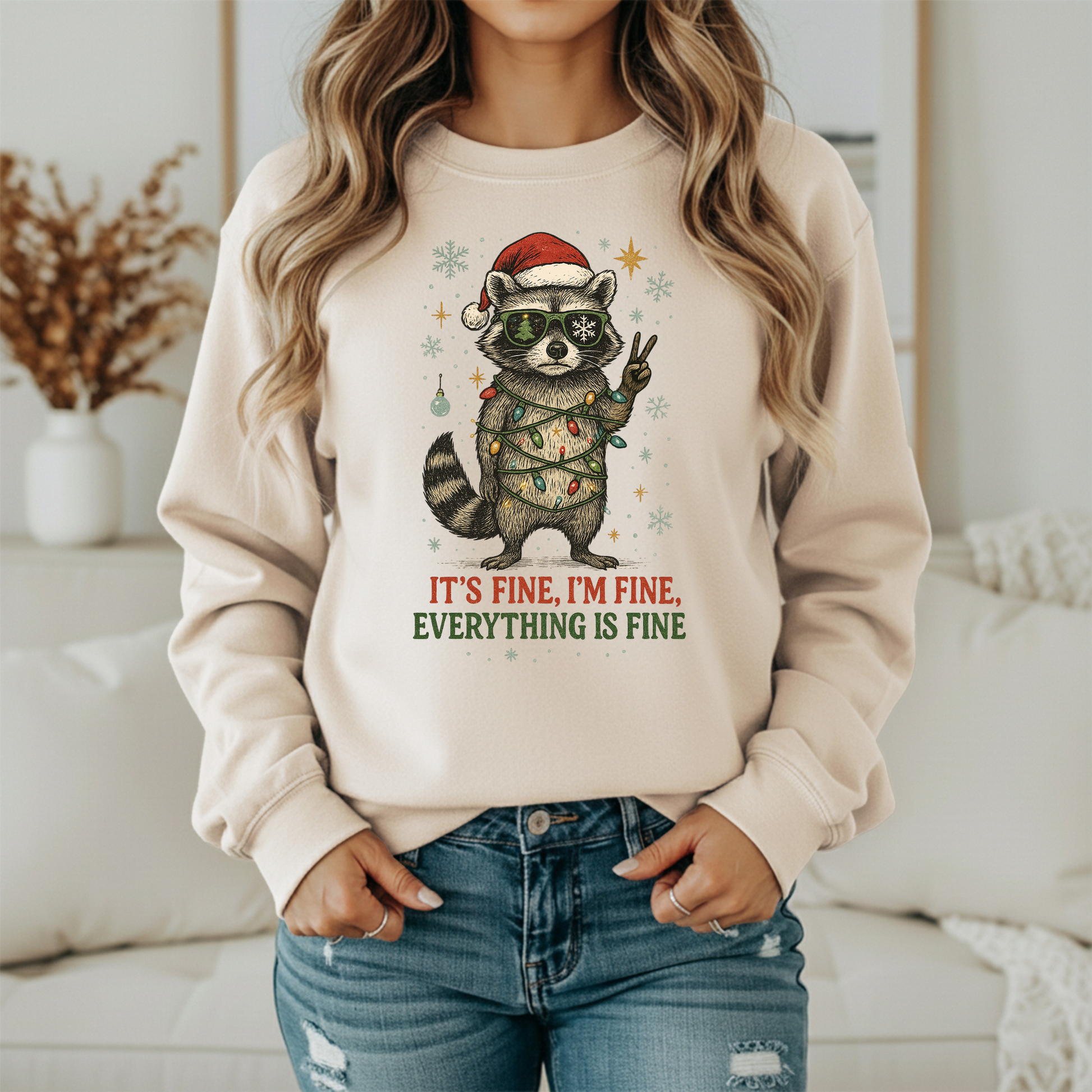 It's Fine I'm Fine Everything Is Fine Raccoon Sweatshirt - Funny Christmas Crewneck - Women's Holiday Gildan Sweatshirt