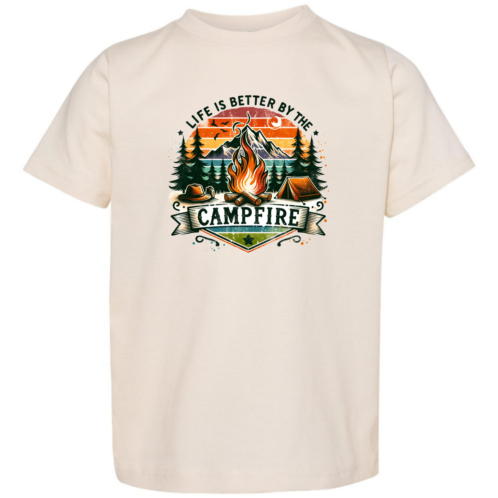 Adventure is calling! Whether they’re roasting marshmallows or telling ghost stories, your little camper will love this outdoorsy tee. Featuring a rustic campfire scene with trees, tents, and mountain views, it’s perfect for summer trips, camping weekends, or cozy nights in the backyard.