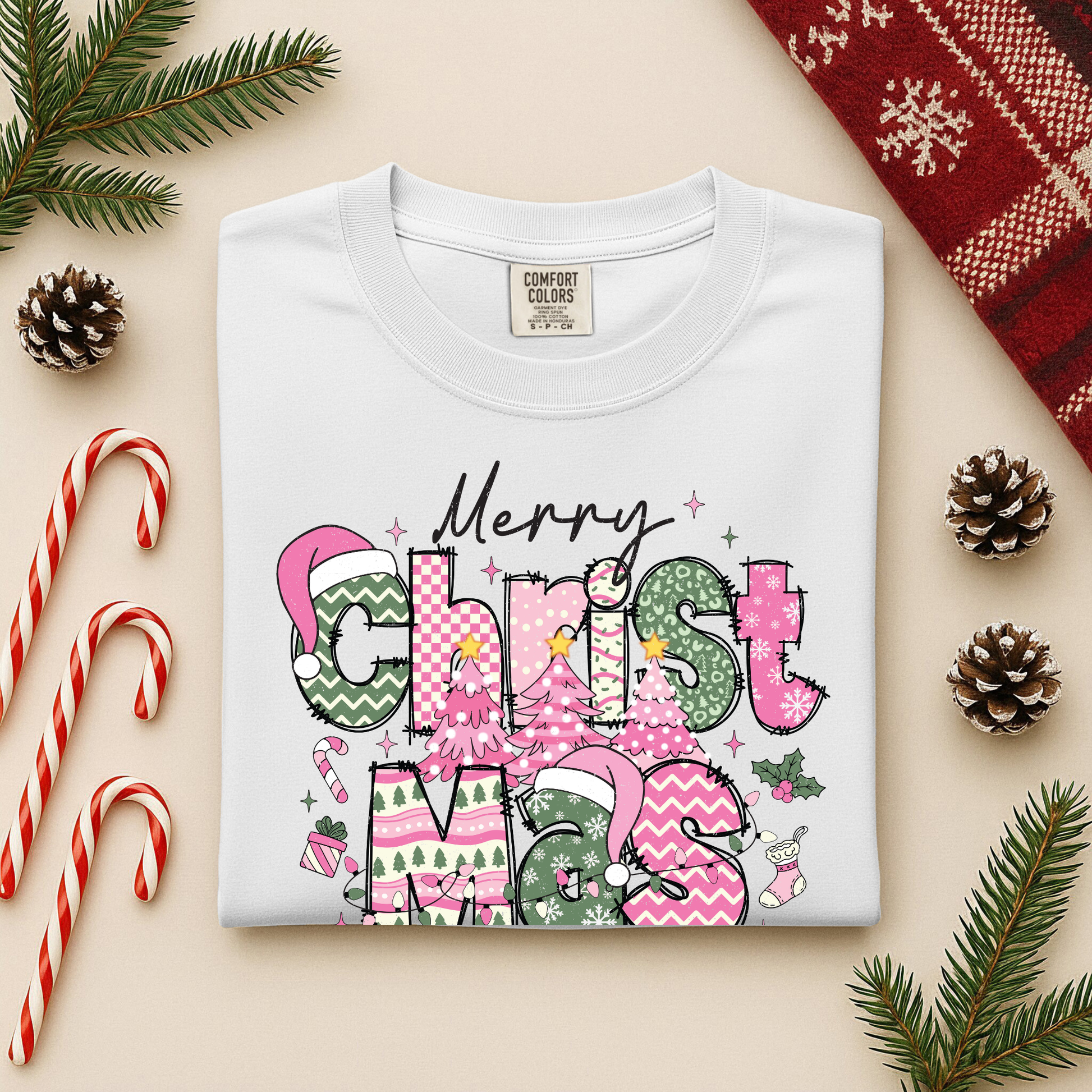 Merry Christmas Comfort Colors Long Sleeve Tee – Pink & Green Holiday Graphic Shirt