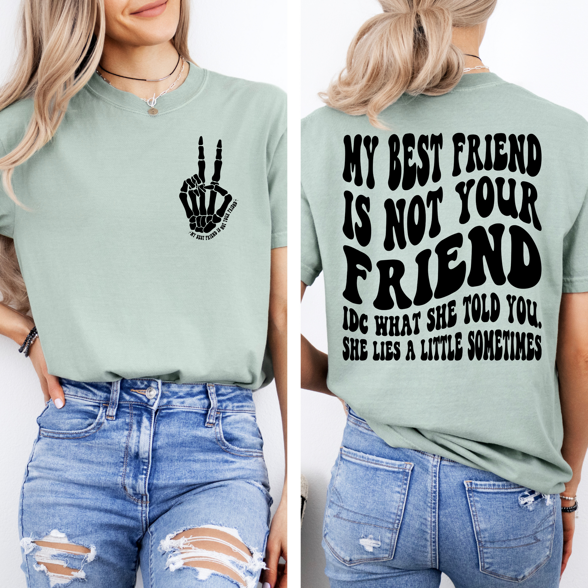 This tee says what you're thinking so you don’t have to. Featuring a bold front skeleton peace hand graphic and large back text that reads: “My best friend is not your friend. IDC what she told you. She lies a little sometimes.” Printed on a sage green Comfort Colors® tee, this shirt combines drama and dry humor with your favorite lived-in softness.