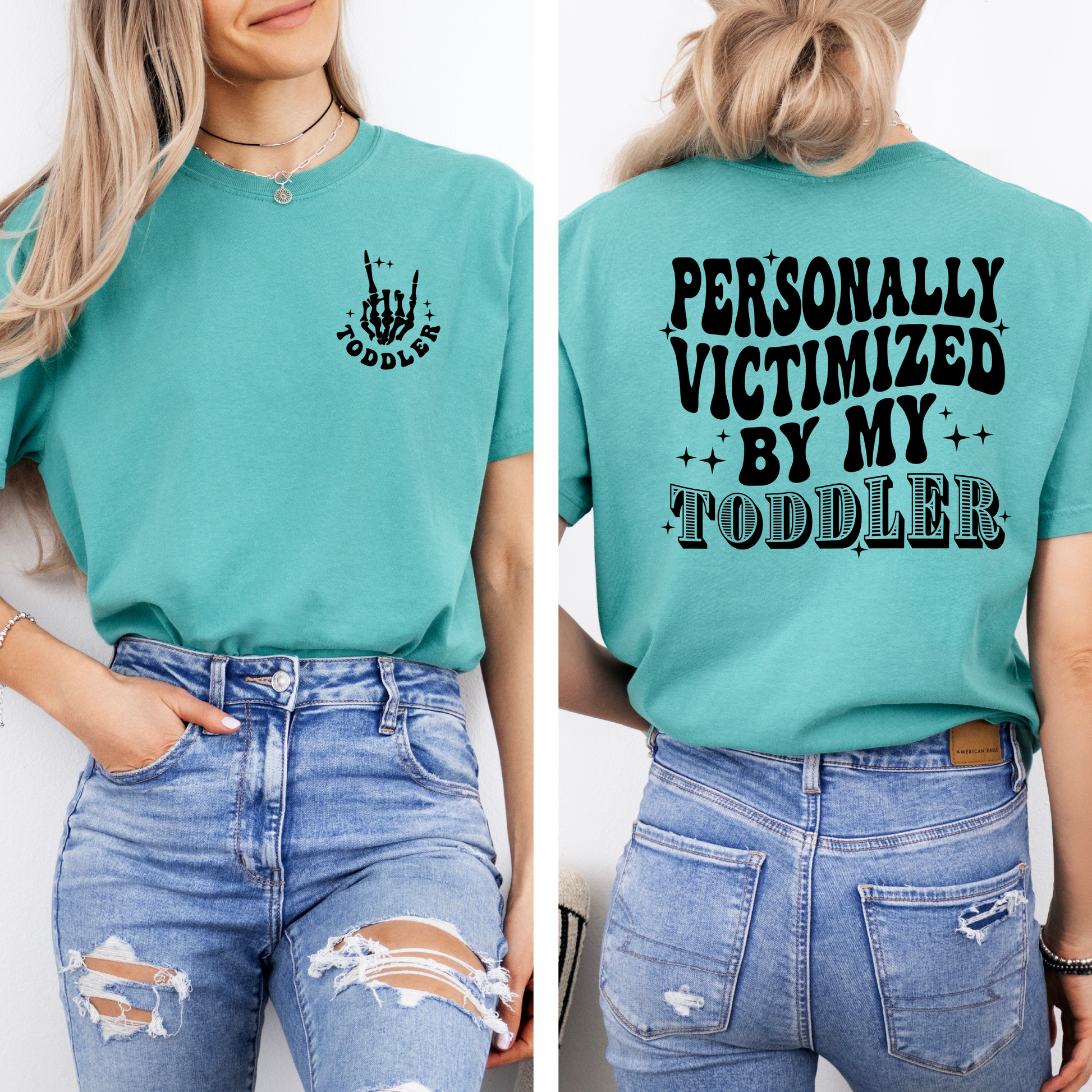 You love them—but wow, are they feral. This seafoam Comfort Colors® tee says what every tired mama is thinking: “Personally Victimized by My Toddler.” With a rocker-style toddler skeleton hand graphic on the front and bold text on the back, it’s the perfect combo of cute and chaotic. Because surviving tantrums deserves a reward—and this tee is it.