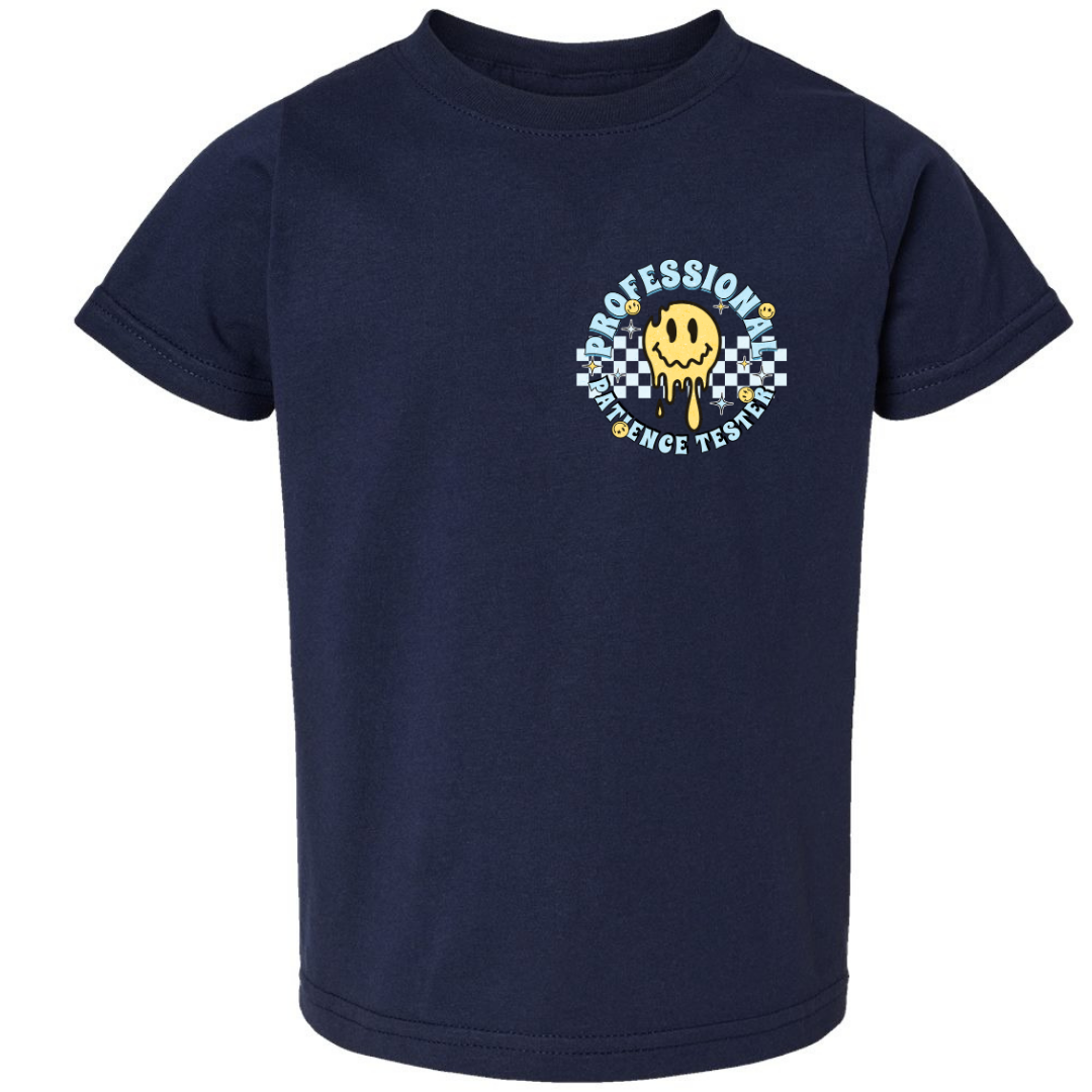 Warning: May cause spontaneous eye rolls and test every ounce of patience you have—but it’s totally worth it 😅 Introducing our Professional Patience Tester kids graphic tee, made for the tiny chaos coordinators in your life. This navy Rabbit Skins brand shirt features playful melting smiley faces, checkerboard patterns, and bold retro lettering on the front and back.
