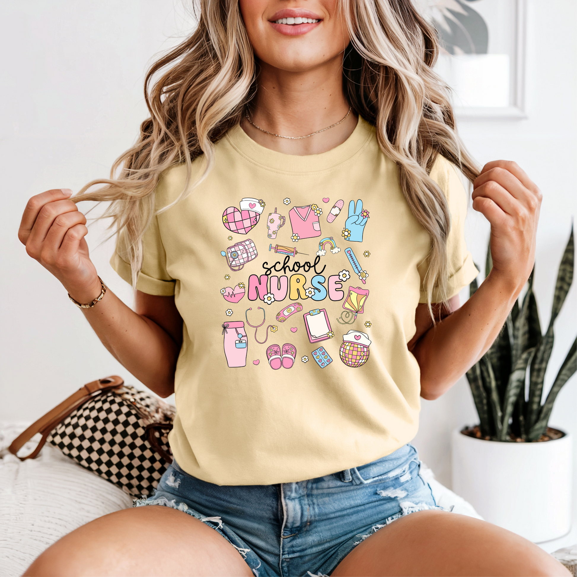 Printed on a soft, sunny Comfort Colors® shirt, this design is bursting with adorable school nurse-themed icons—think clipboards, thermometers, cozy slippers, and a whole lot of love. It’s a cheerful and colorful way to celebrate those who keep our kiddos (and staff) feeling their best.