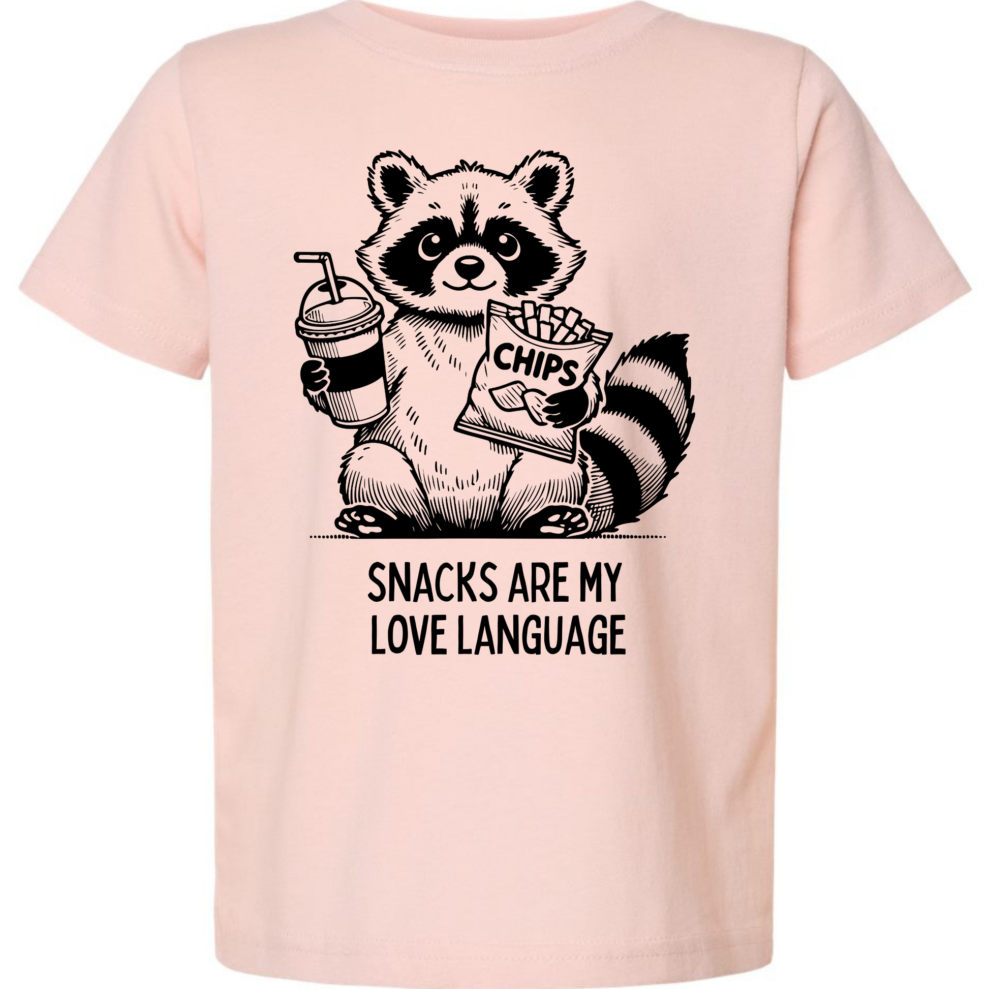Snack time = love time. This adorable Snacks Are My Love Language tee features a snack-loving raccoon who's got chips in one paw and a drink in the other—relatable, right? Perfect for your little snack monster who expresses love one crunchy bite at a time.
