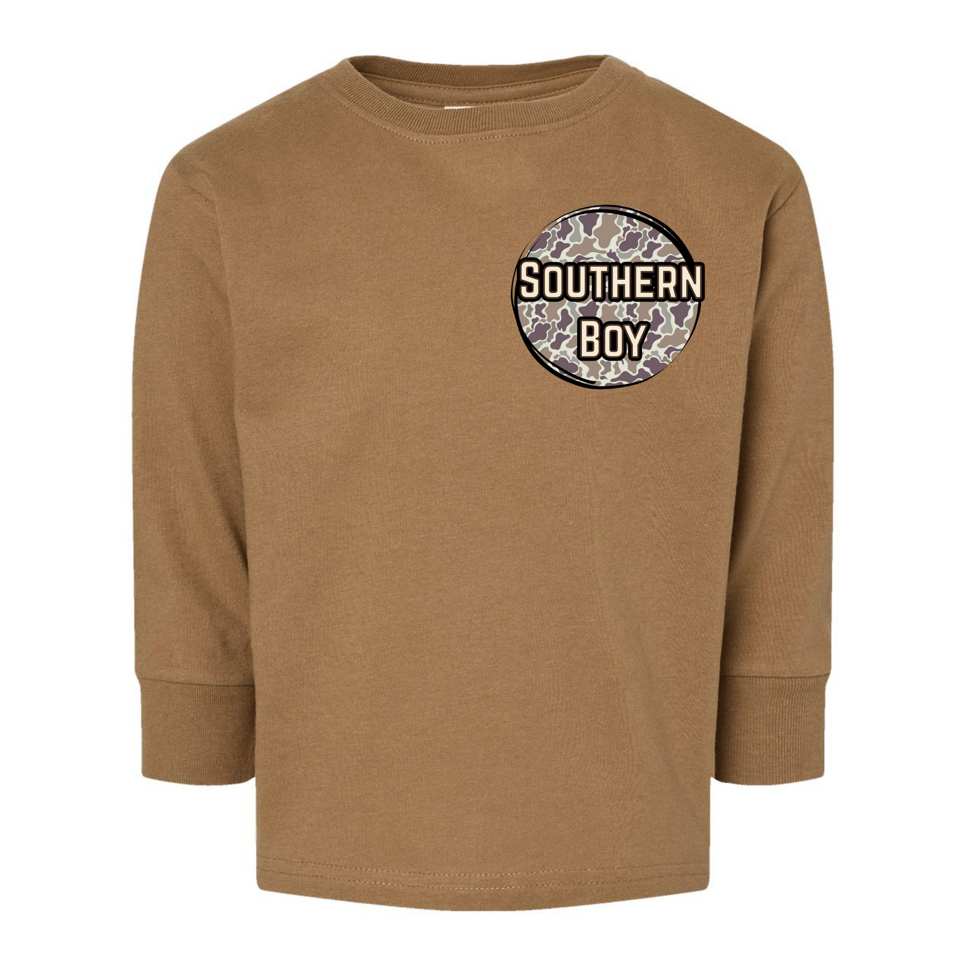 For the little outdoorsman who’s proud of his roots 🦌🍂 — our Rabbit Skins Coyote Brown Long Sleeve Tee is the perfect fall staple. The front features a subtle camo “Southern Boy” logo, while the back showcases a bold hunting design with the heartfelt phrase “My First Hunting Buddy Will Always Be My Daddy.”