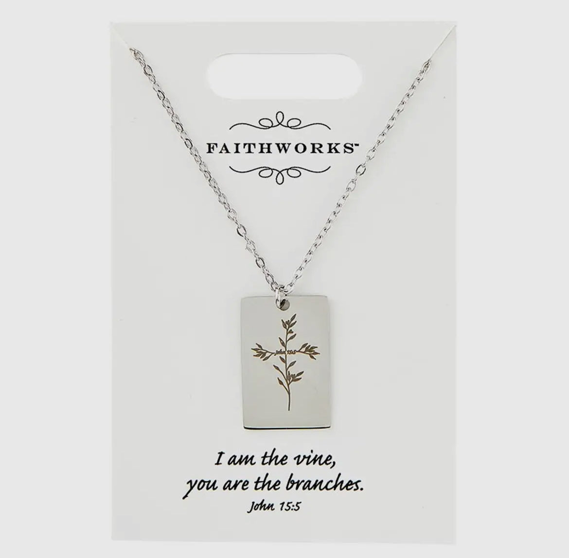 Carry a message of faith and growth with our Square Vine Silver Necklace. This elegant piece features a rectangular silver-tone pendant engraved with a delicate vine, inspired by John 15:5: “I am the vine, you are the branches.” It’s a meaningful reminder that we are all connected and supported through faith.