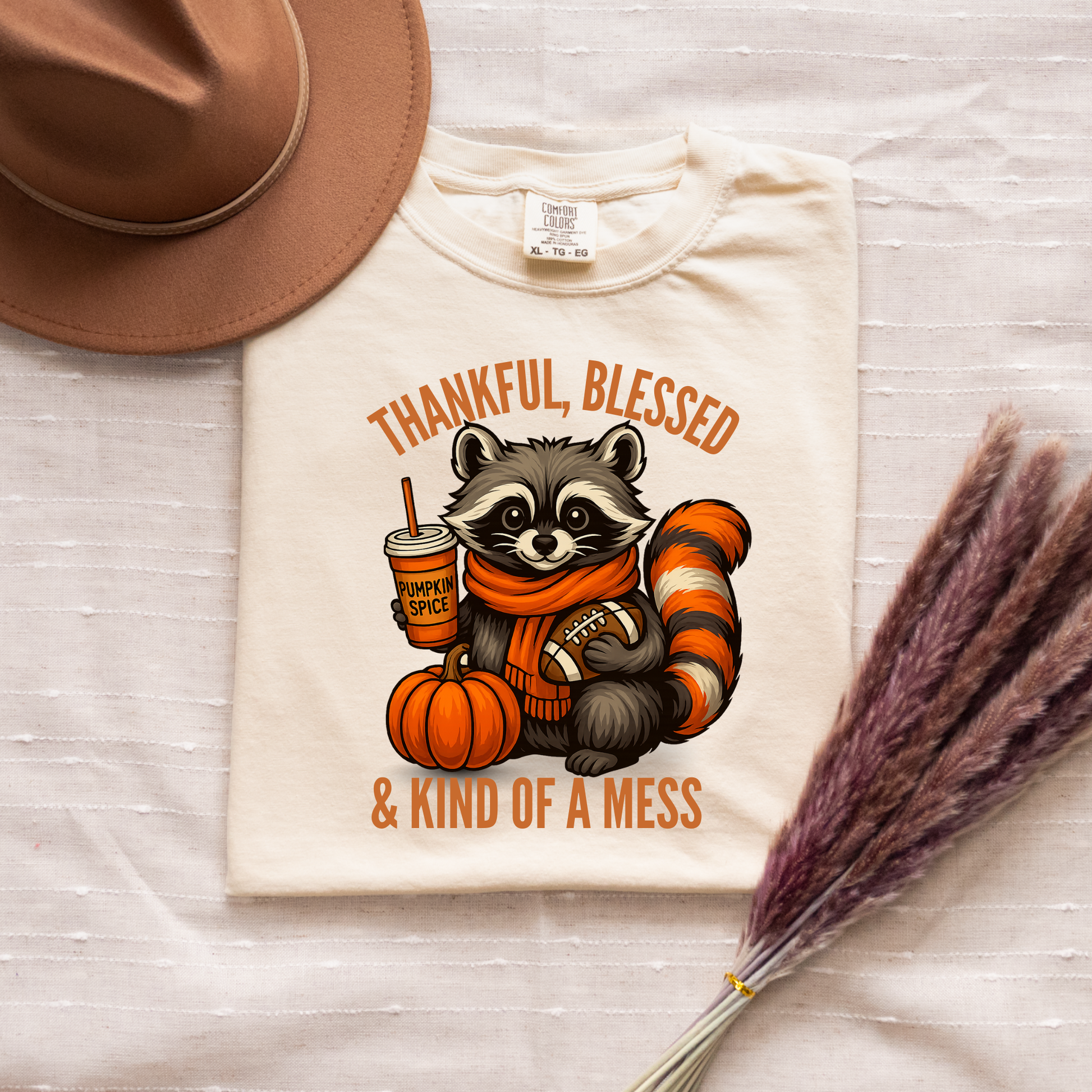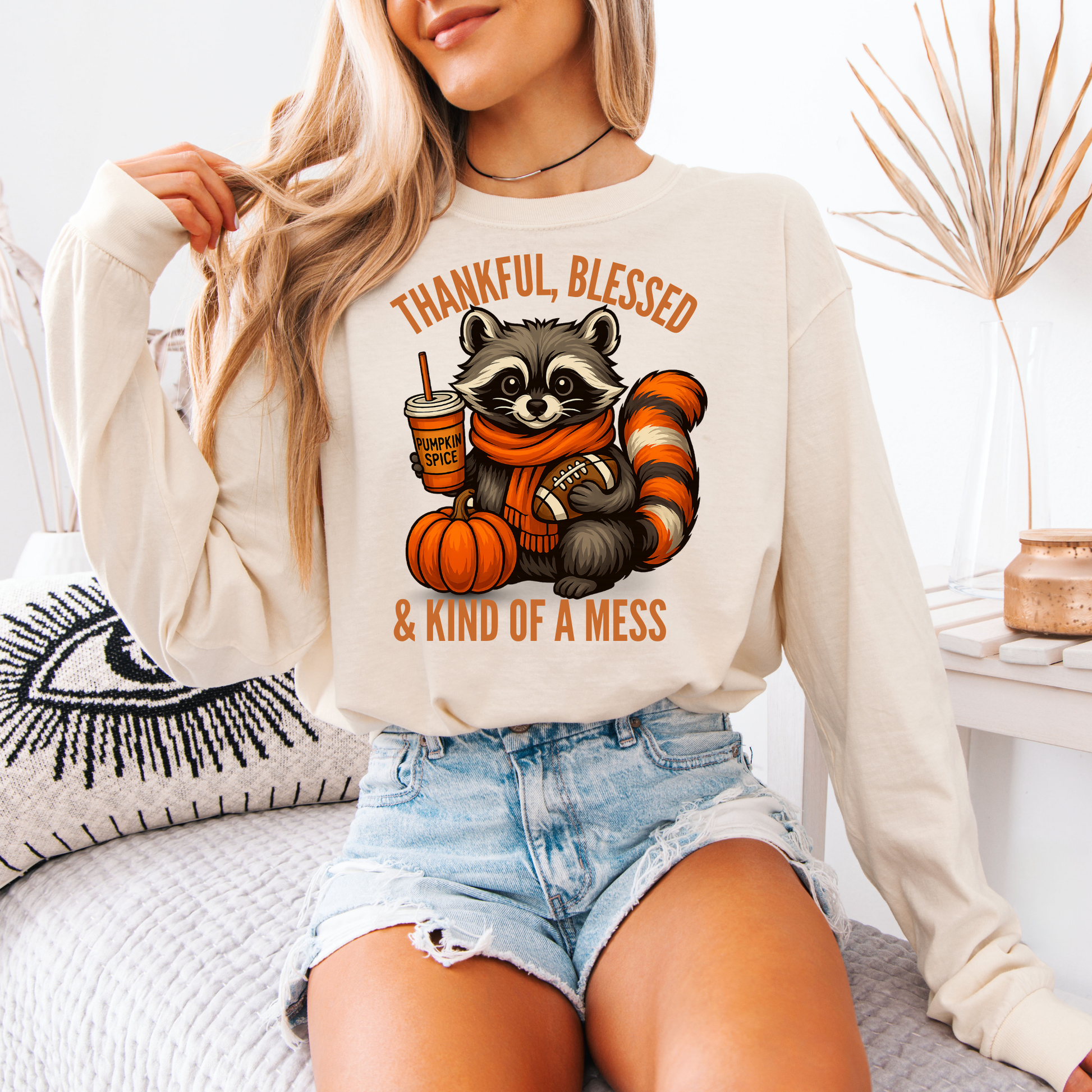 Fall in love with cozy vibes and playful style with our Comfort Colors Ivory Long Sleeve Tee featuring the cutest raccoon dressed for autumn. This tee is soft, oversized in feel, and perfect for layering with jeans, leggings, or flannels for those crisp fall days. The fun graphic reads “Thankful, Blessed & Kind of a Mess” – a reminder that life (and fall) is all about embracing the chaos with a smile.