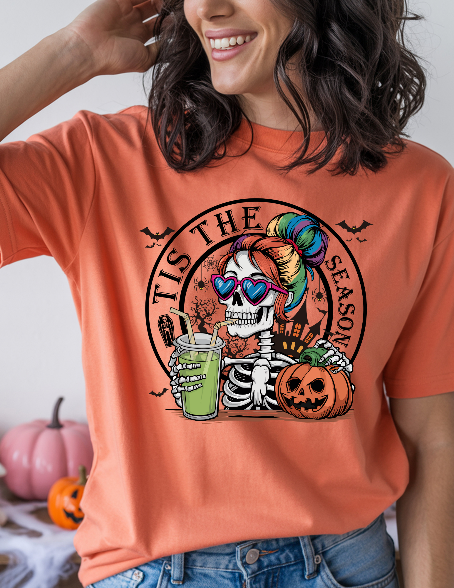 Celebrate spooky season in style with our Comfort Colors® ’Tis the Season Graphic Tee! This fun design features a trendy skeleton rocking a rainbow bun, heart-shaped sunglasses, and sipping a spooky drink while pumpkins and bats set the Halloween scene. With its bold and colorful artwork, this tee is perfect for anyone who loves playful, festive Halloween fashion.