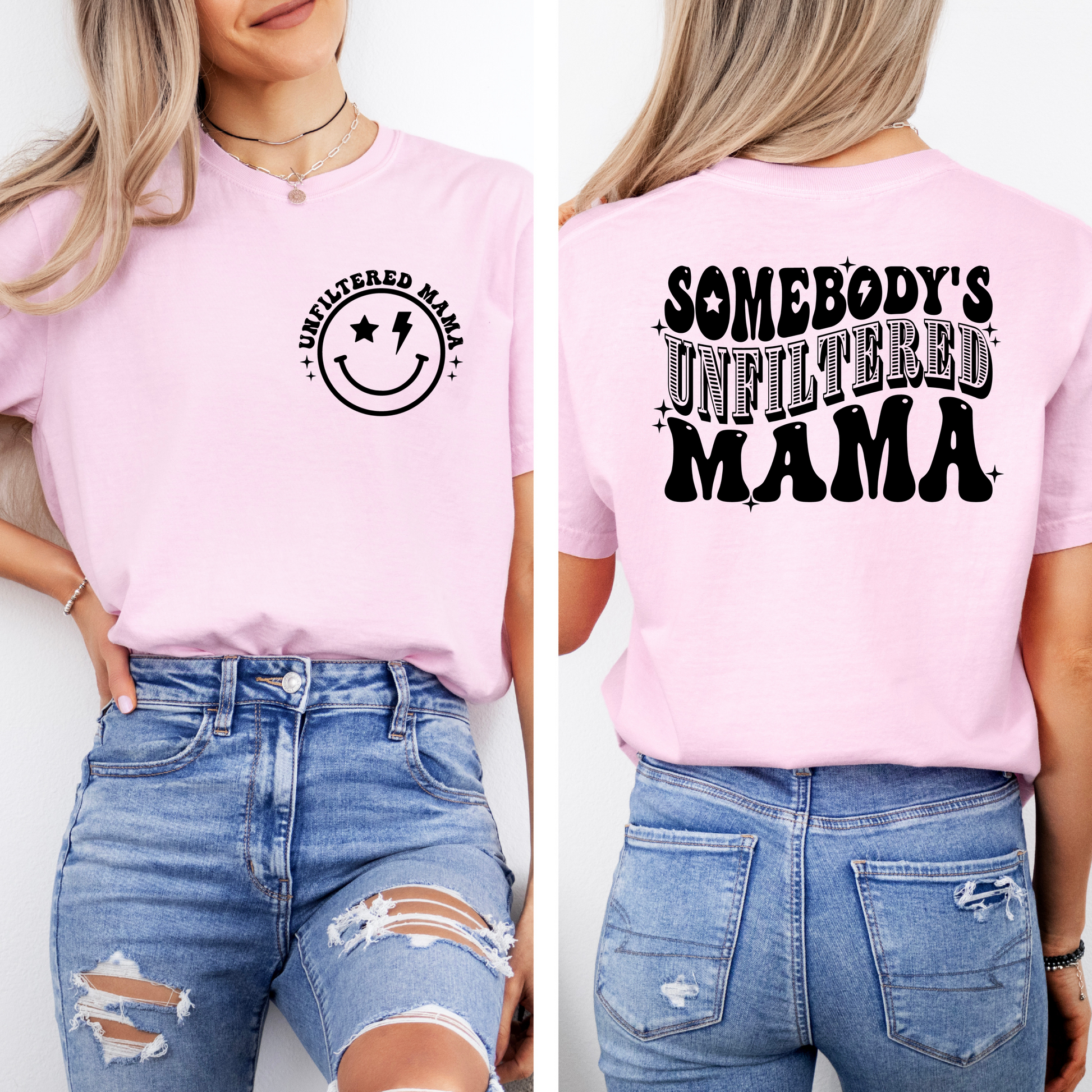 Because you keep it real—no filters, no fluff. The “Somebody’s Unfiltered Mama” tee in blossom pink is made for moms who embrace the mess and still serve looks. Crafted from the famously cozy Comfort Colors® cotton, this tee features a lightning-bolt smiley face on the front and bold, retro bubble letters on the back. It’s fun, fierce, and unapologetically mom-mode.
