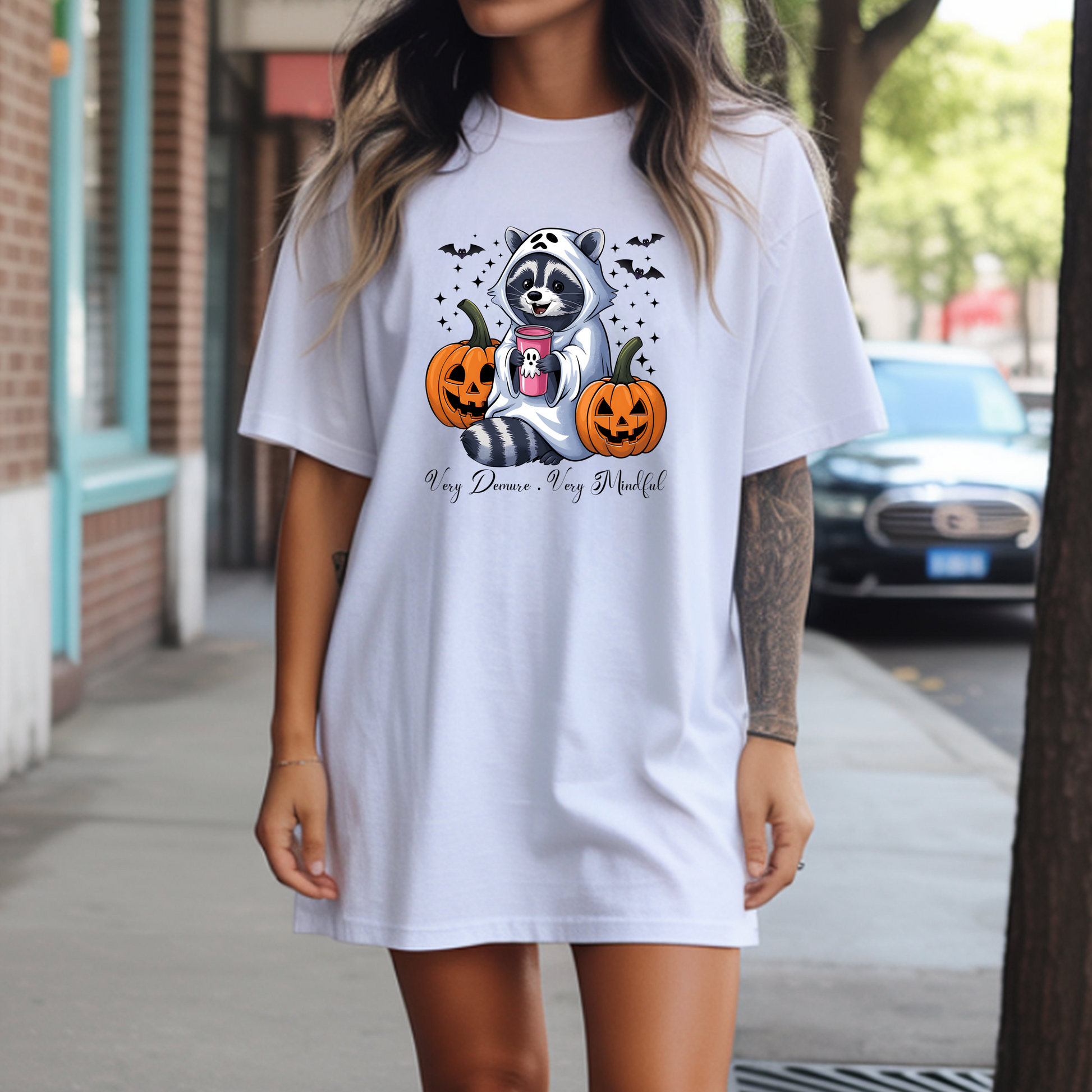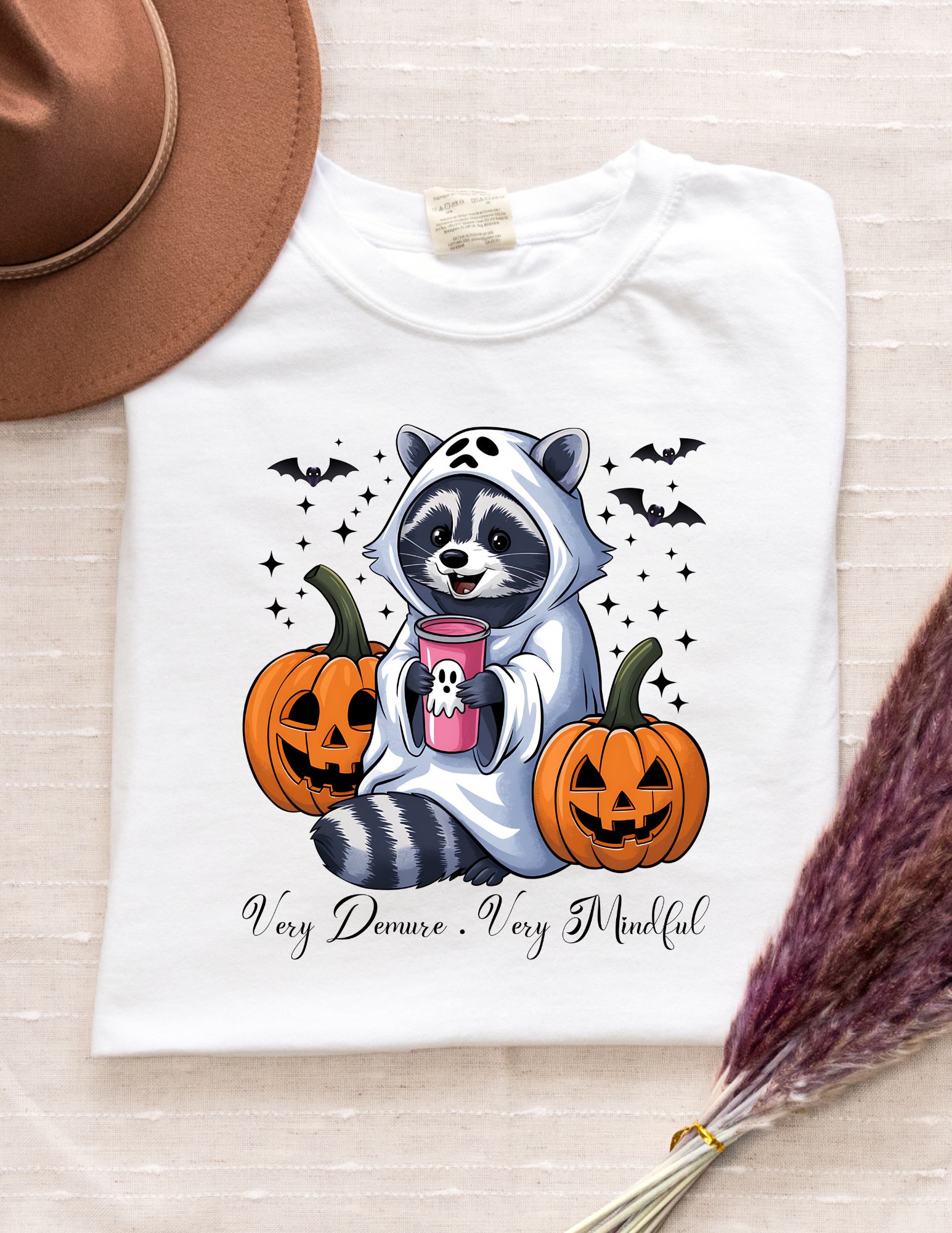 Very Demure, Very Mindful Raccoon Halloween T-Shirt – White Comfort Colors | Pumpkin & Ghost Coffee Cute Fall Tee